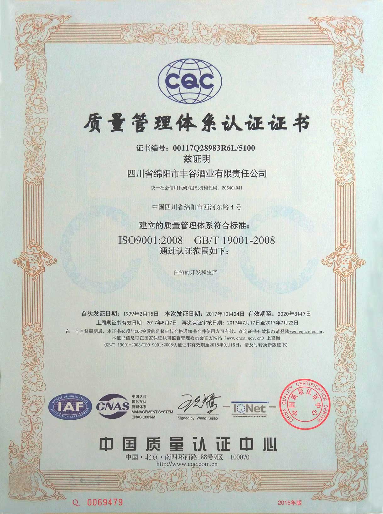 質(zhì)量管理體系認(rèn)證證書(首次發(fā)證日期:1999年2月15日,認(rèn)證范圍:白酒的開發(fā)和生產(chǎn))---中、英文版(證書編號:00117Q28983R6L/5100,ISO9001:2008,GB/T19001-2008)