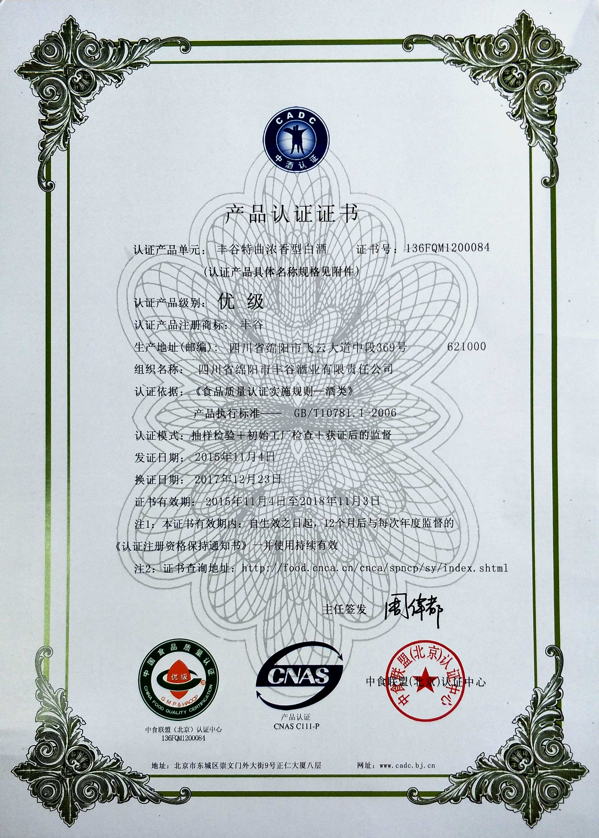 產(chǎn)品認(rèn)證證書(豐谷牌濃香型白酒)---優(yōu)級--證書號:136FQM1200084