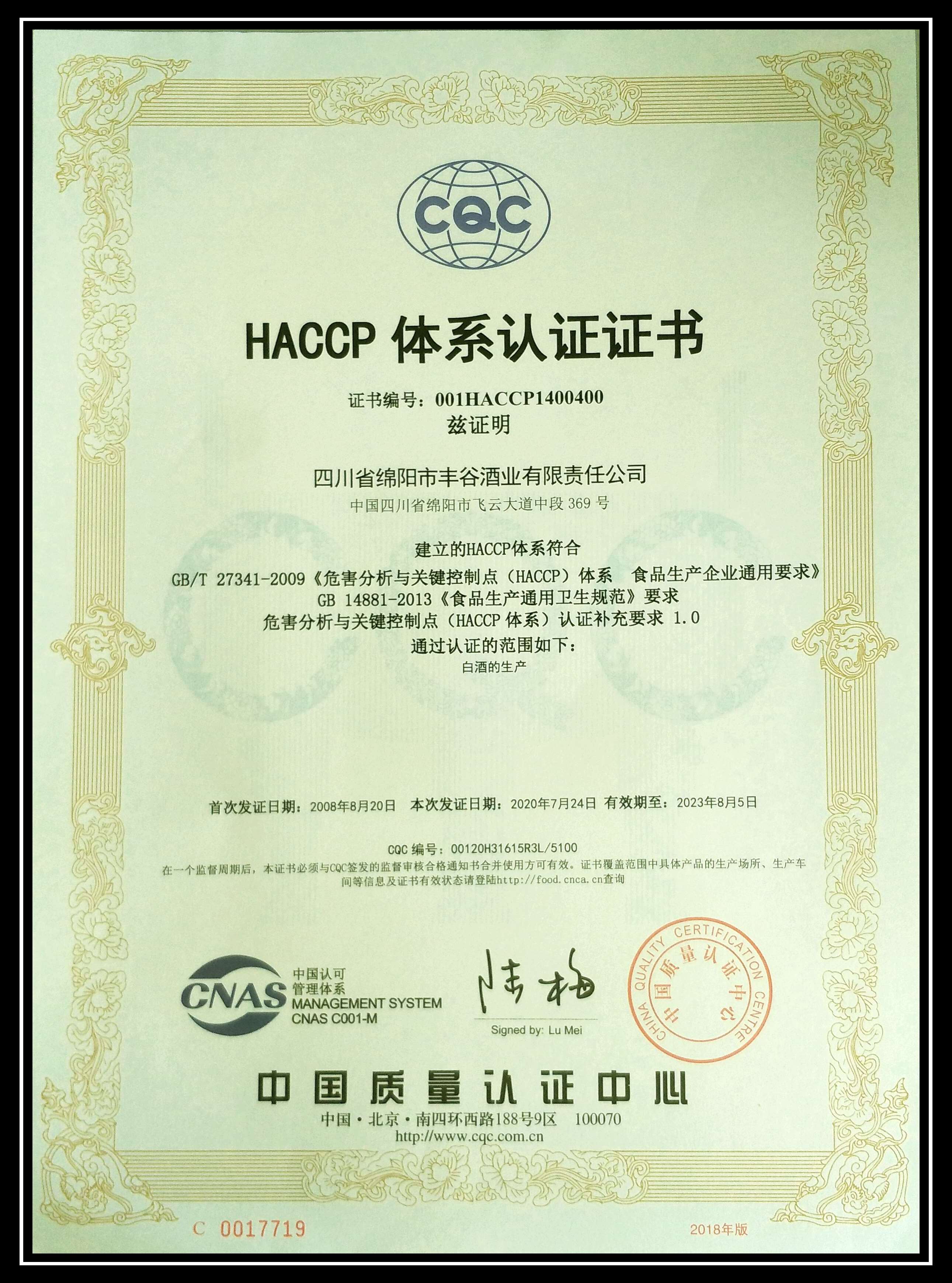 HACCP認(rèn)證證書
