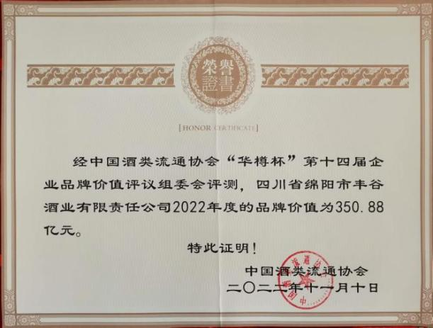 2022年華樽杯評估豐谷酒業(yè)全年實現(xiàn)品牌價值350.88億元